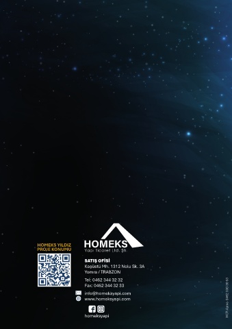 HOMEKS YILDIZ PROJE KONUMU SATIŞ OFİSİ Kaşüstü Mh. 1312 Nolu Sk. 3A Yomra / TRABZON Tel: 0462 344 32 32 Fax: 0462 344 32 33 info@homeksyapi.com www.homeksyapi.com HCR Ajans 0462 330 30 03 homeksyapi