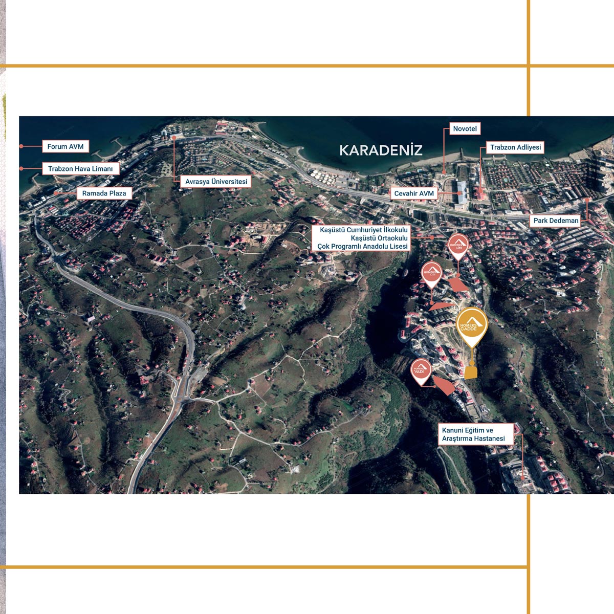 Projemiz (Homeks Cadde) lokasyon olarak Trabzon’un Yalıncak Mahallesi'nde, önü (deniz manzarası) kesilmeyecek bir yaşam alanı projesi olarak planlanmıştır.