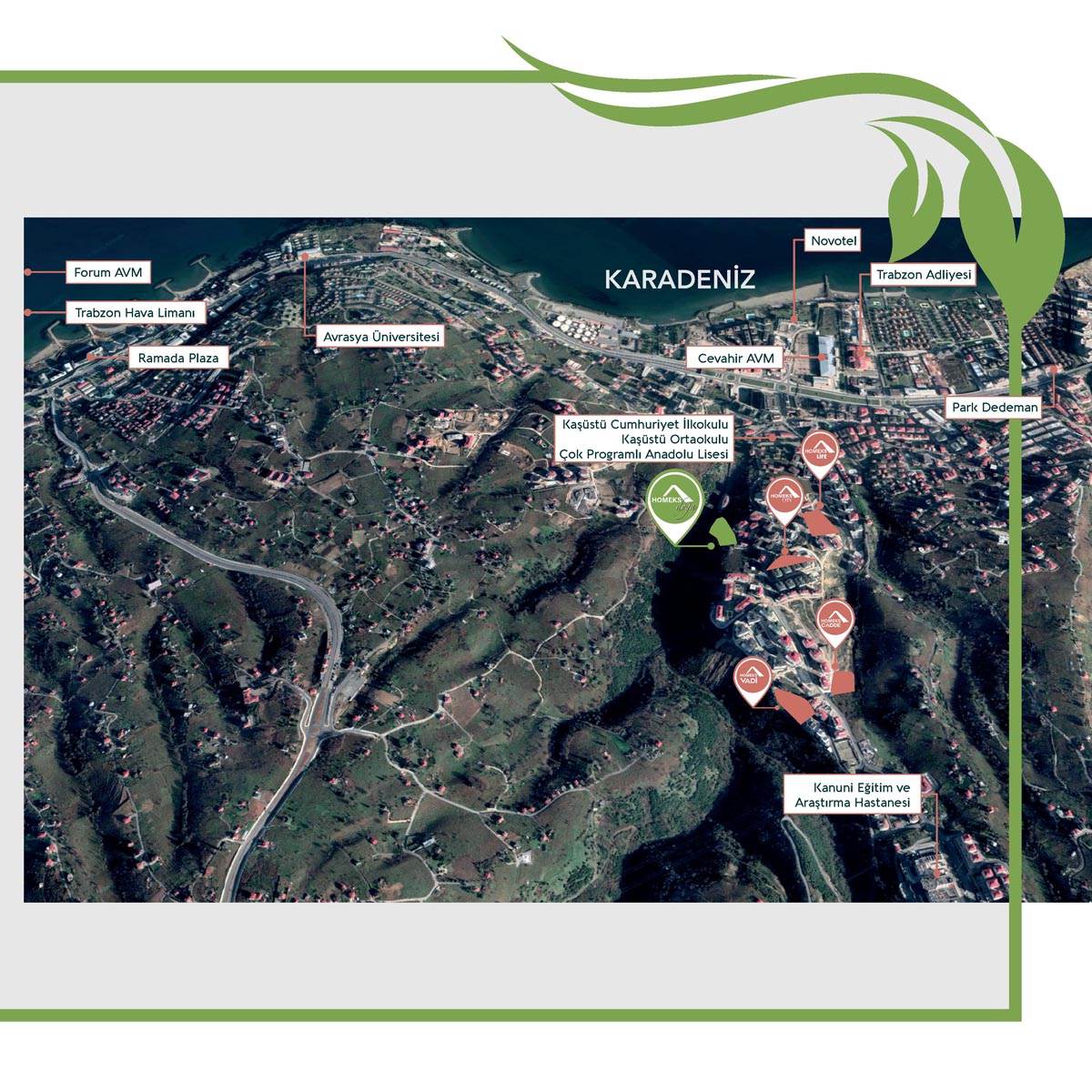 Projemiz (Homeks Doğa) lokasyon olarak Trabzon’un Yalıncak Mahallesi'nde, önü (deniz manzarası) kesilmeyecek bir yaşam alanı projesi olarak planlanmıştır.